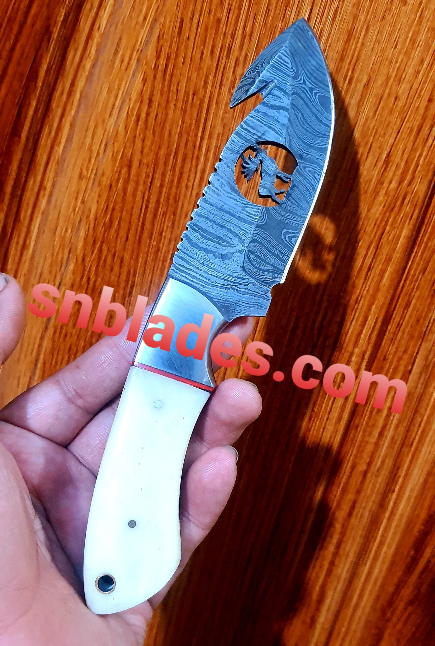 Handmade Damascus steel gut hook Skinner knife overall length 8″inch handle made of bone hold edge and comfortable handle grip comes with Leather sheath.