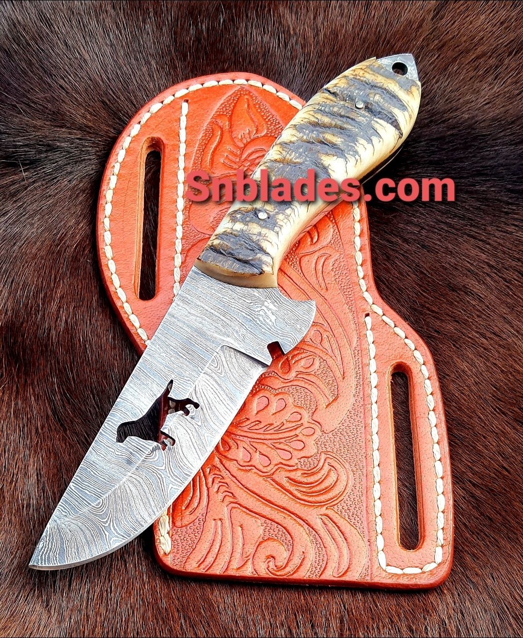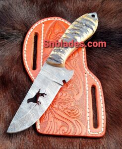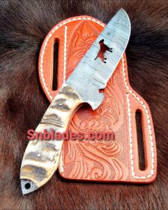 Handmade Damascus Steel Cowboy Hunting Skinner Knife overall length 8″inch handle made of Ram horn hold edge and comfortable handle comes with leather sheath..