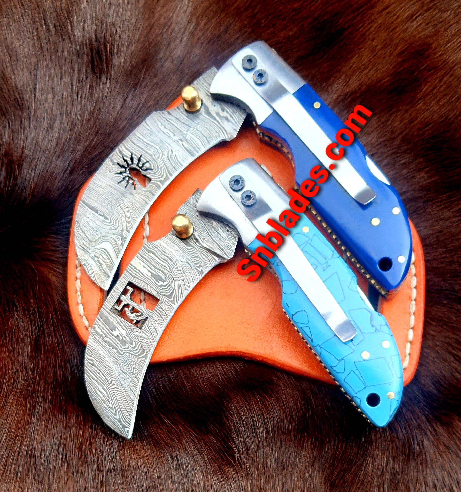 Handmade Damascus Steel IBEW and Hawksbill Lineman Folding Knifes
