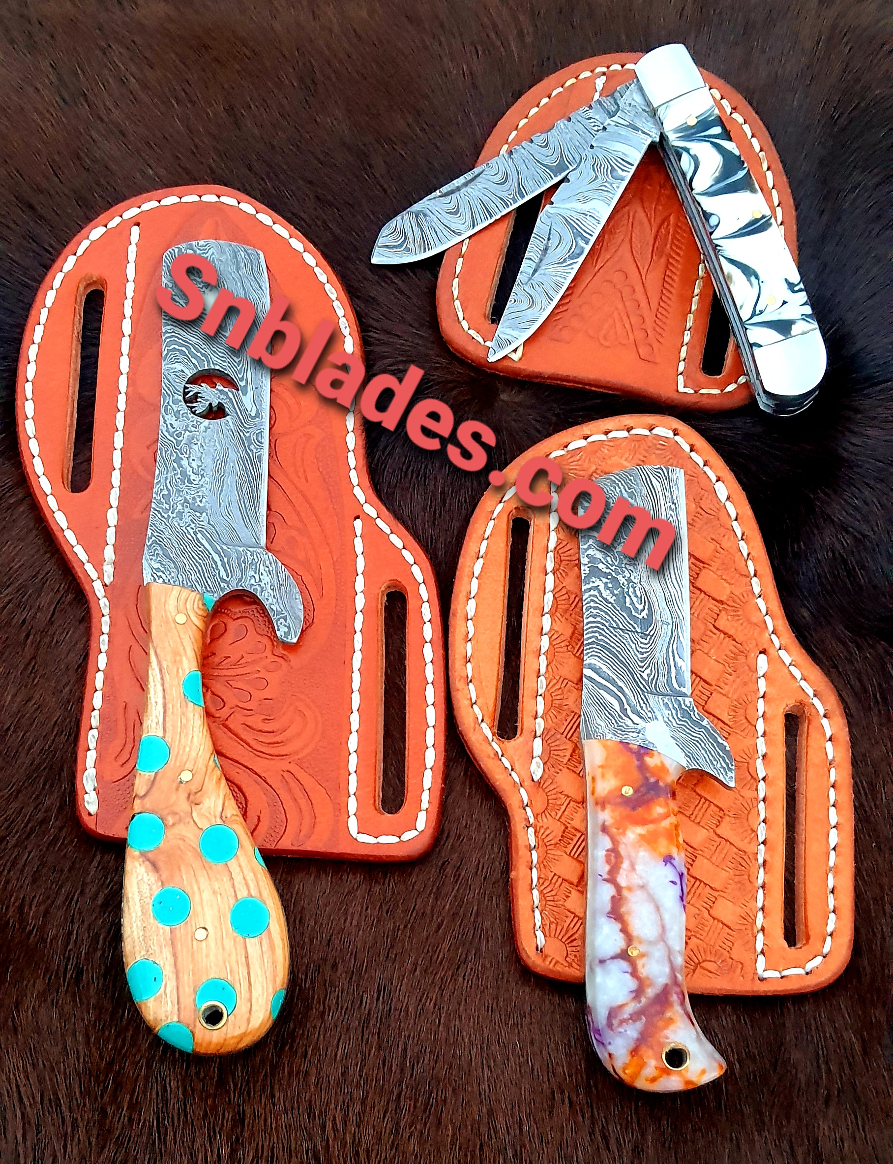 Handmade Damascus Steel Three Cowboy bull cutter and Folding knives overall length 6″inch to 8″inch Folding knife 7″inch Handle made of Resin and wood hold edges and comfortable handle comes with Three leather sheaths..