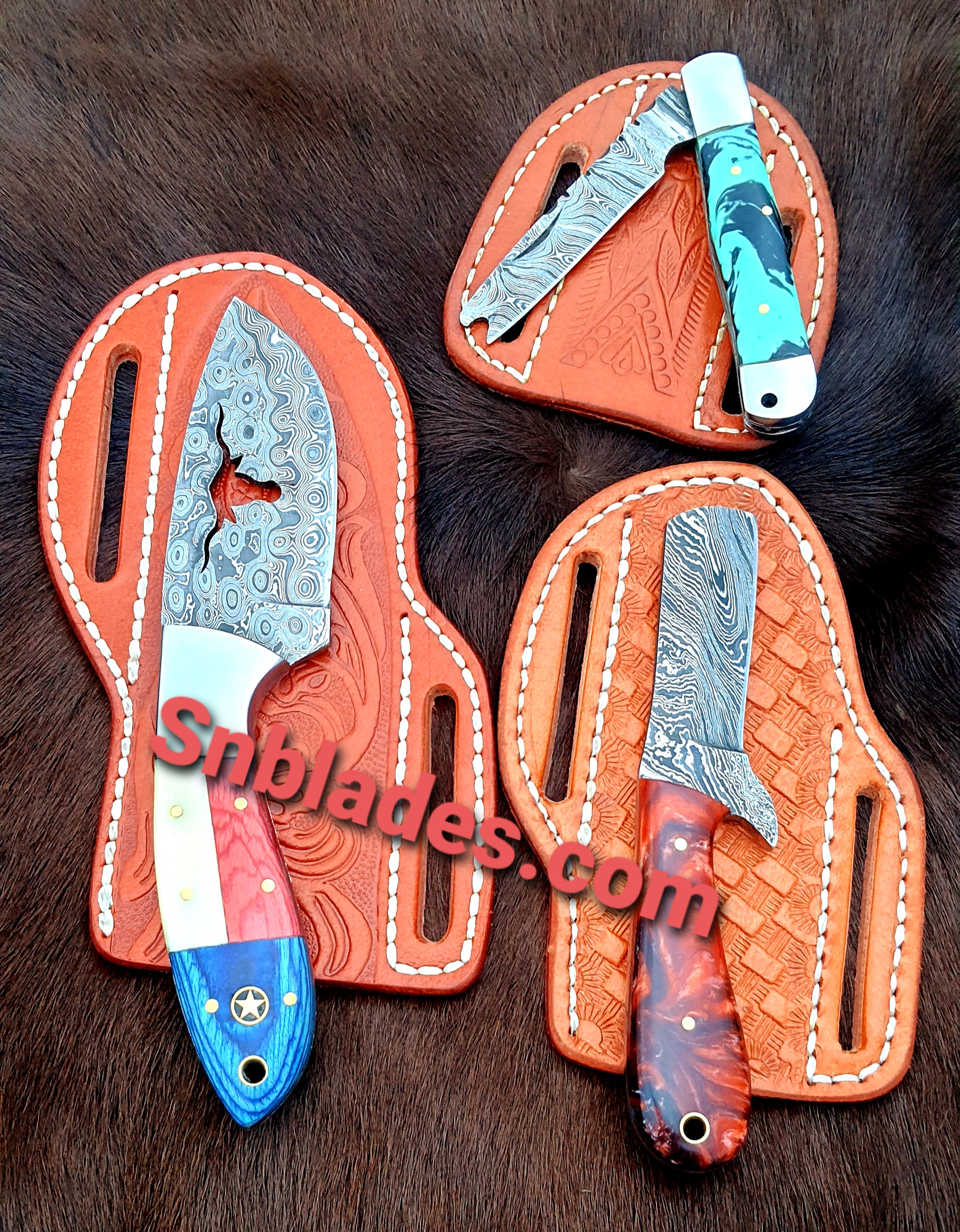 Handmade Damascus Steel Three Cowboy Skinner and bull cutter and Folding knives overall length 6″inch to 8″inch and Folding knife 7″inch handle made of Resin and Taxes Flage handle hold edges and comfortable handle comes with Three Cowboy leather sheaths..