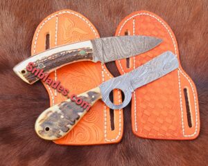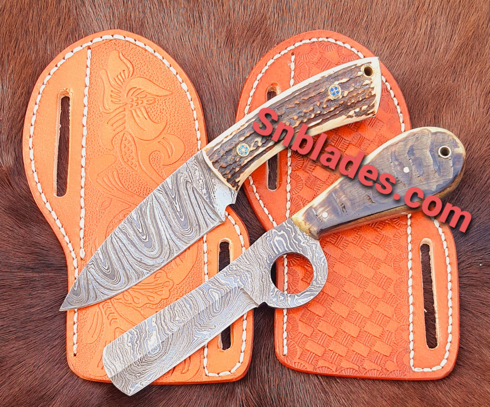 Handmade Damascus steel two Cowboy pistol cutter and Skinner knives overall length 8″inch Handle made of stage horn and Ram Horn hold edge and comfortable handle comes with two leather sheaths..
