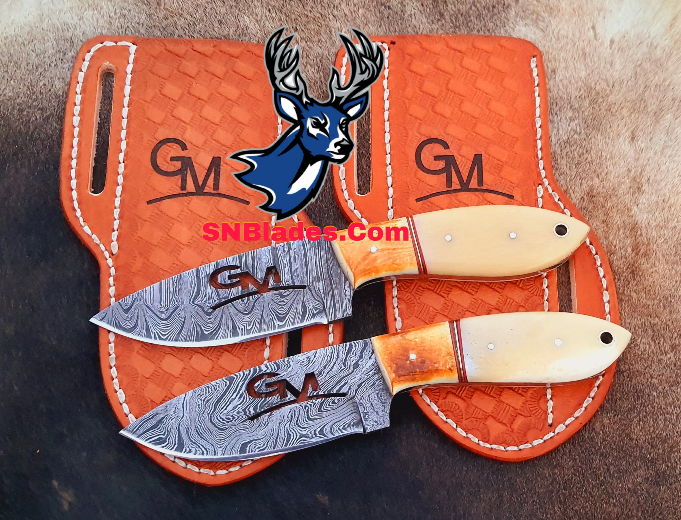 Handmade Damascus steel two cowboy skinner knives overall length 8″inch handle made of Deer bone hold edge and comfortable handle comes with two leather sheaths..