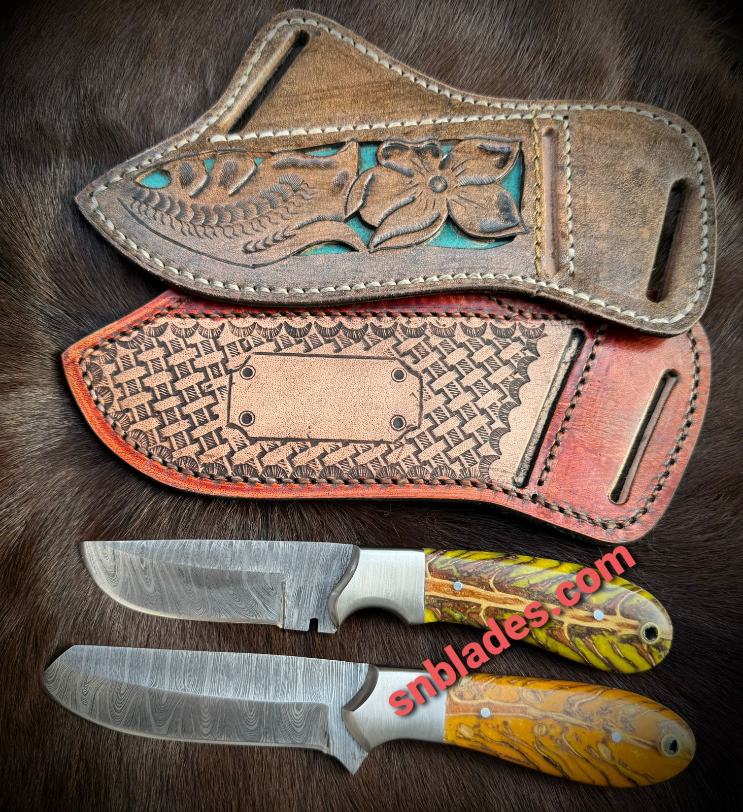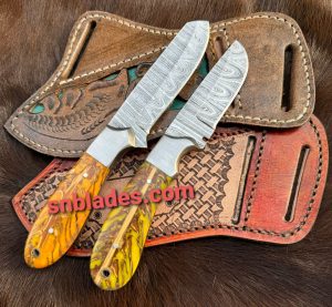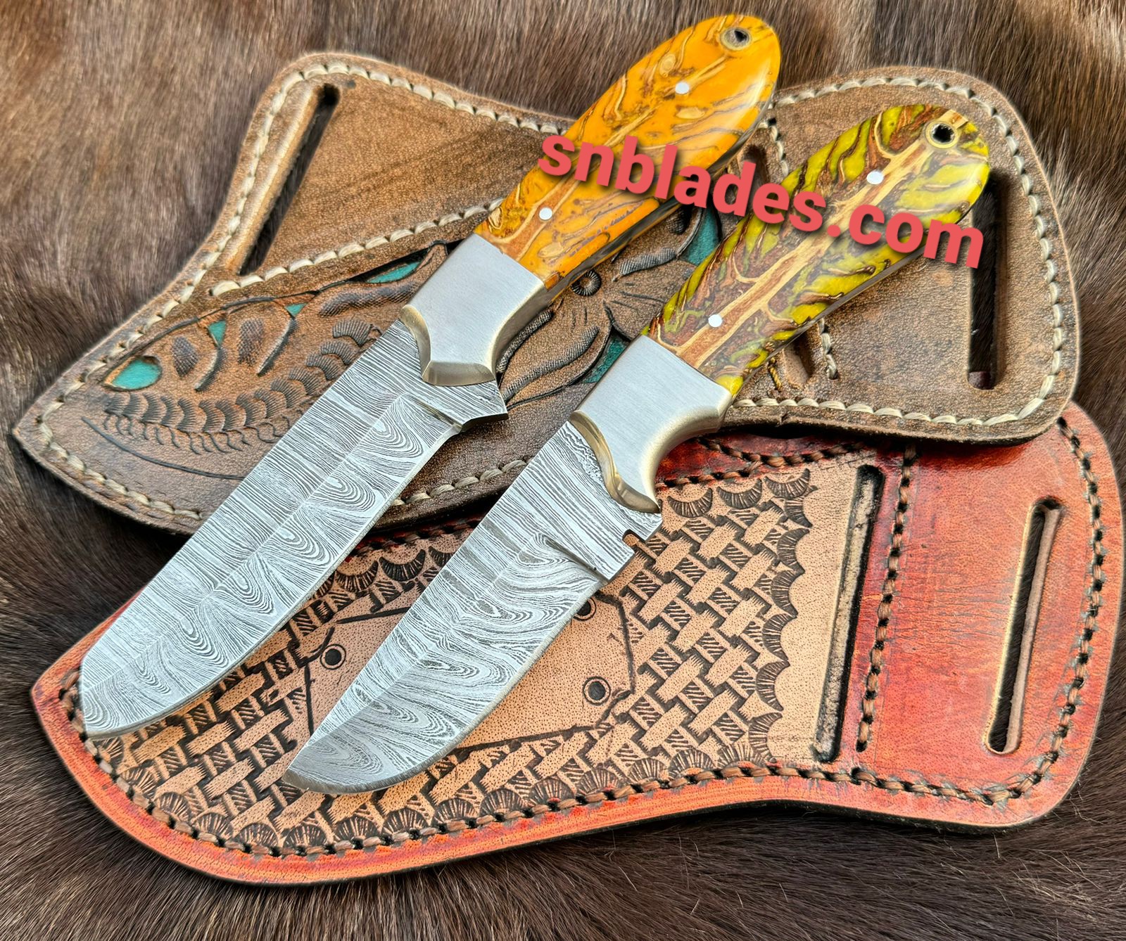 Handmade Damascus steel Cowboy skinner knives set overall length 8″inch Handle length 4″inch Blade length 4″inch Handle made of pine coon with Resin hold edges and Comfortable Grip Comes with Both leather Sheaths as a picture.