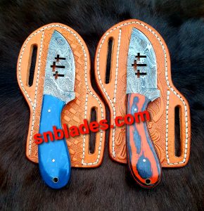 Handmade Damascus steel two cowboy skinner knives set overall length 8″inch handle made of Resin and dollar wood hold edge and Comfortable handle comes with both leather sheaths.