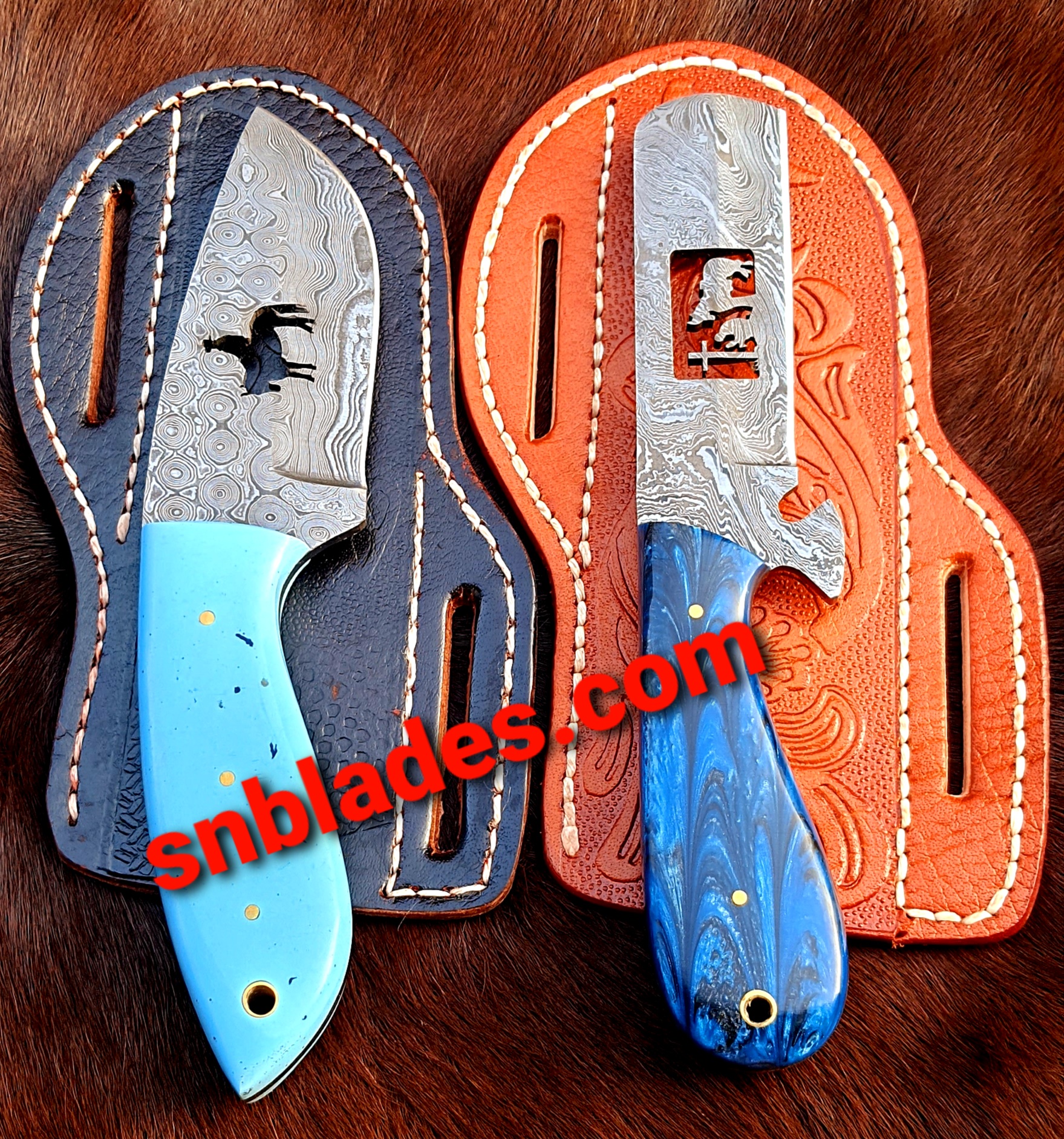 Handmade Damascus steel two Cowboy Skinner knives overall length 8″inch handle made of Resin hold edge and comfortable handle comes with two leather sheaths.