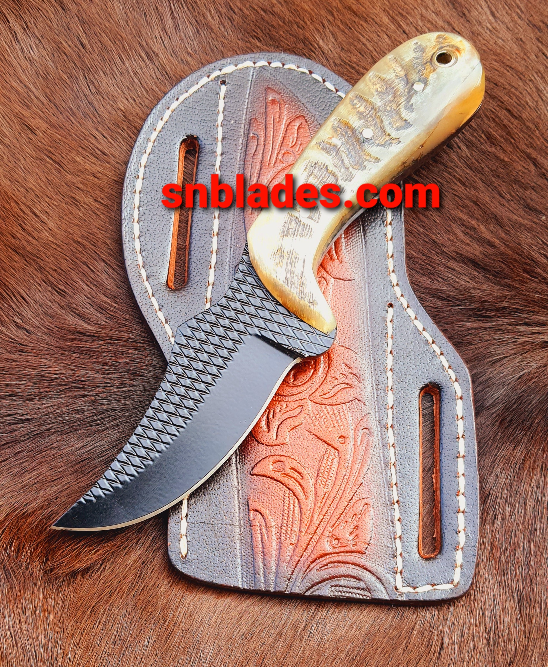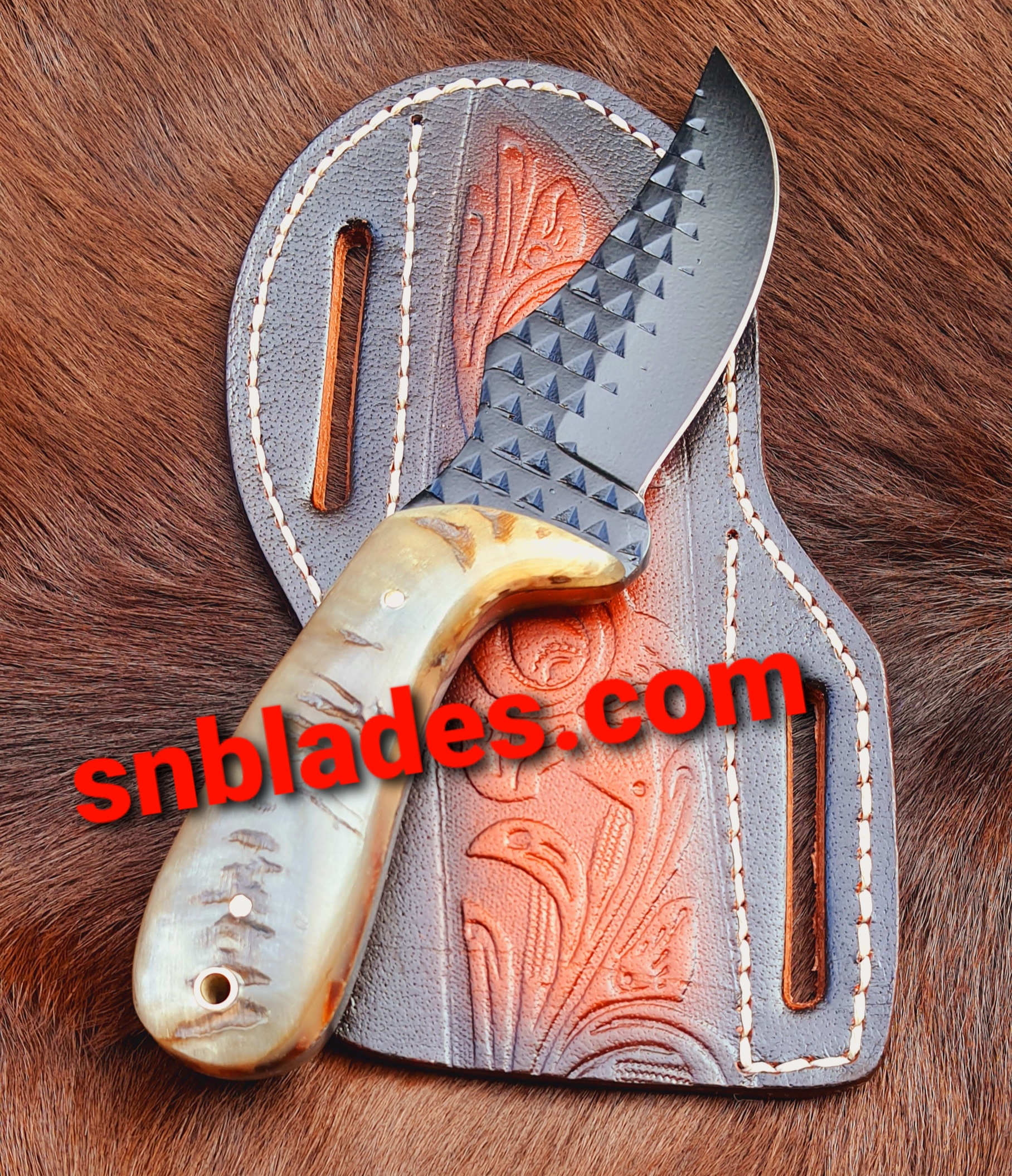 Handmade Rasp steel Cowboy Skinner Knife overall length 8″inche Handle made of Ram Horn hold edge and comfortable Handle comes with Leather sheath.