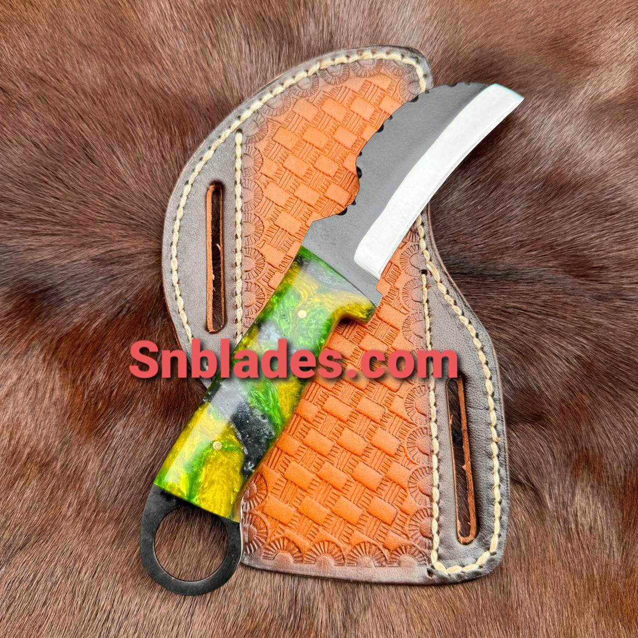 Handmade 1095 steel Hawkbill Lineman Skinner knife overall length 8″inch Handle made of Resin Hold edge and comfortable Grip comes with leather sheath.