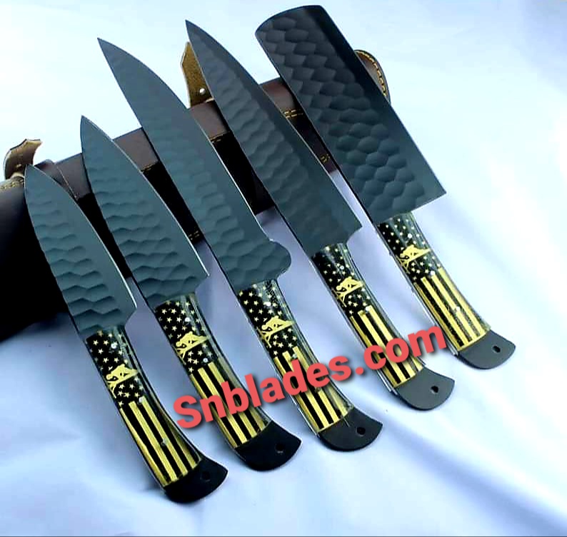 Handmade 1095 steel Lineman kitchen knives set overall length 8″inch to 13″inch Handle made of Print Resin Hold edge and comfortable Grip Comes with Leather Bag..