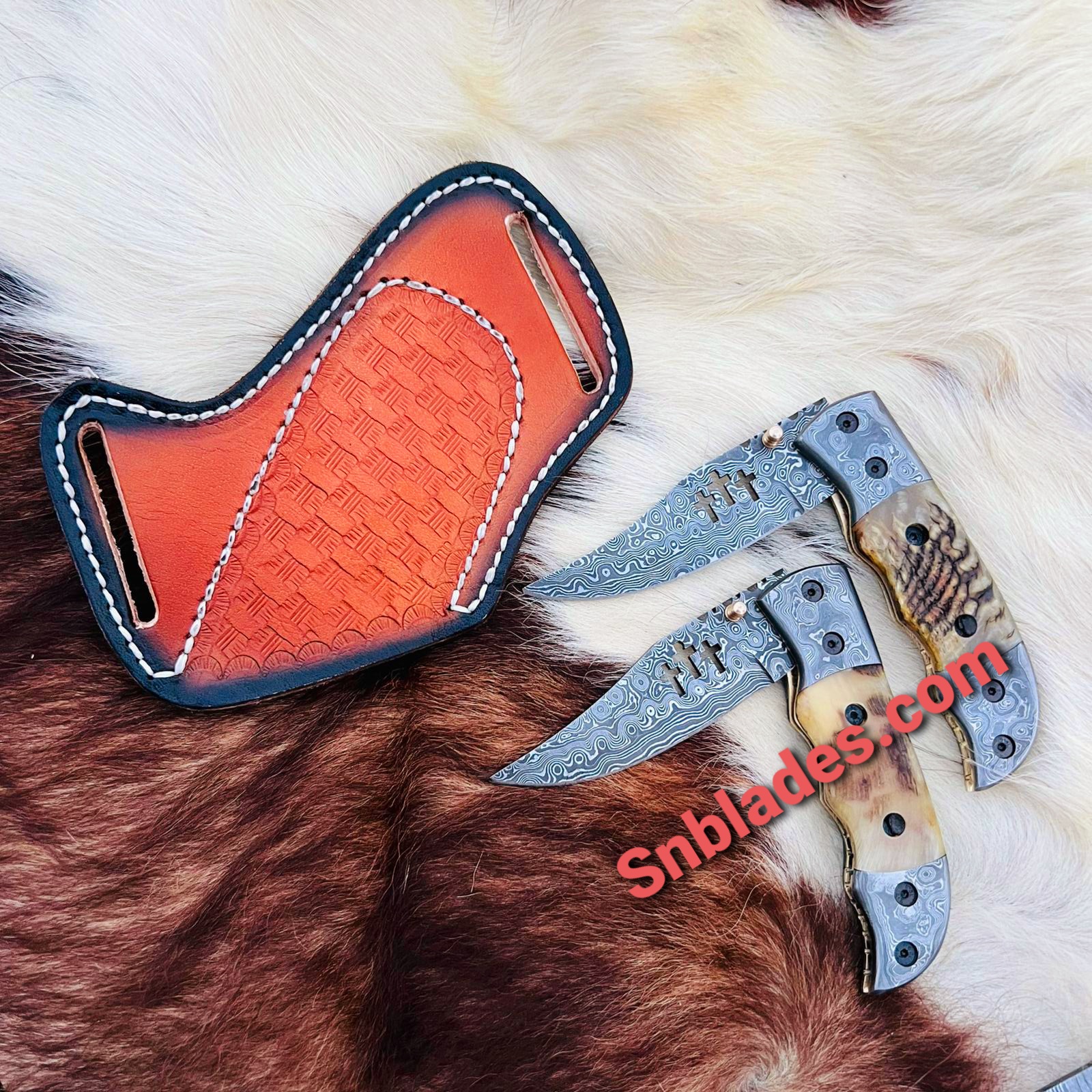 New Custom made Damascus Steel Two Cowboy Folding knives set.