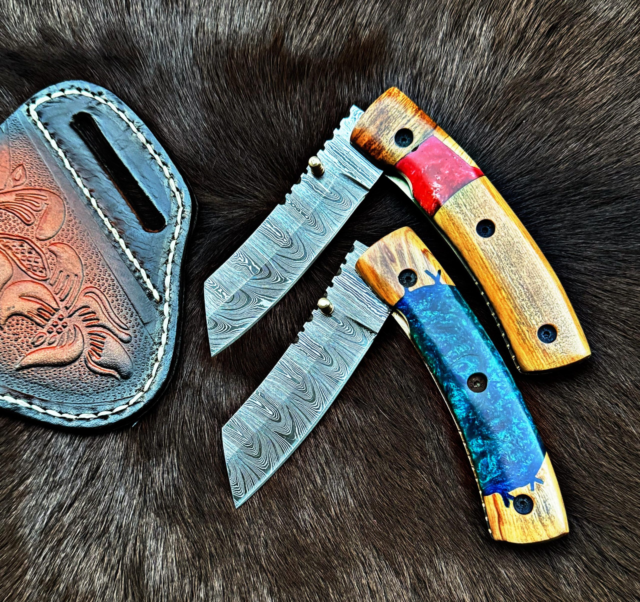 Custom Made Damascus steel Two cowboy Folding knifes set.