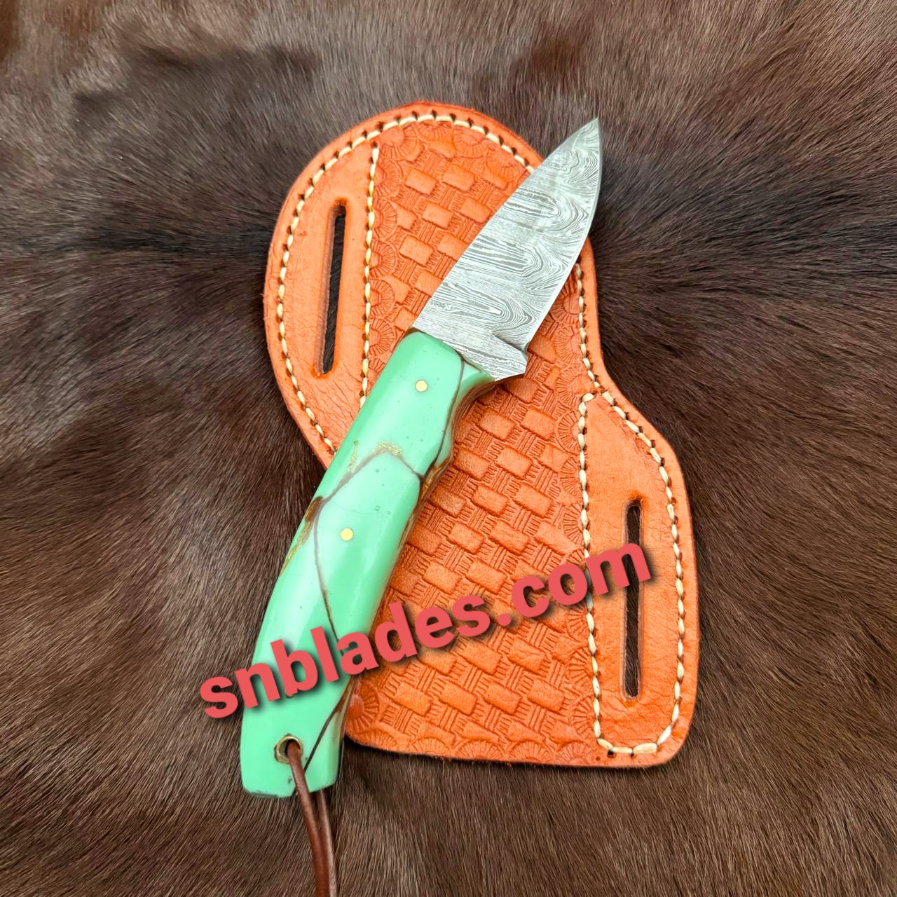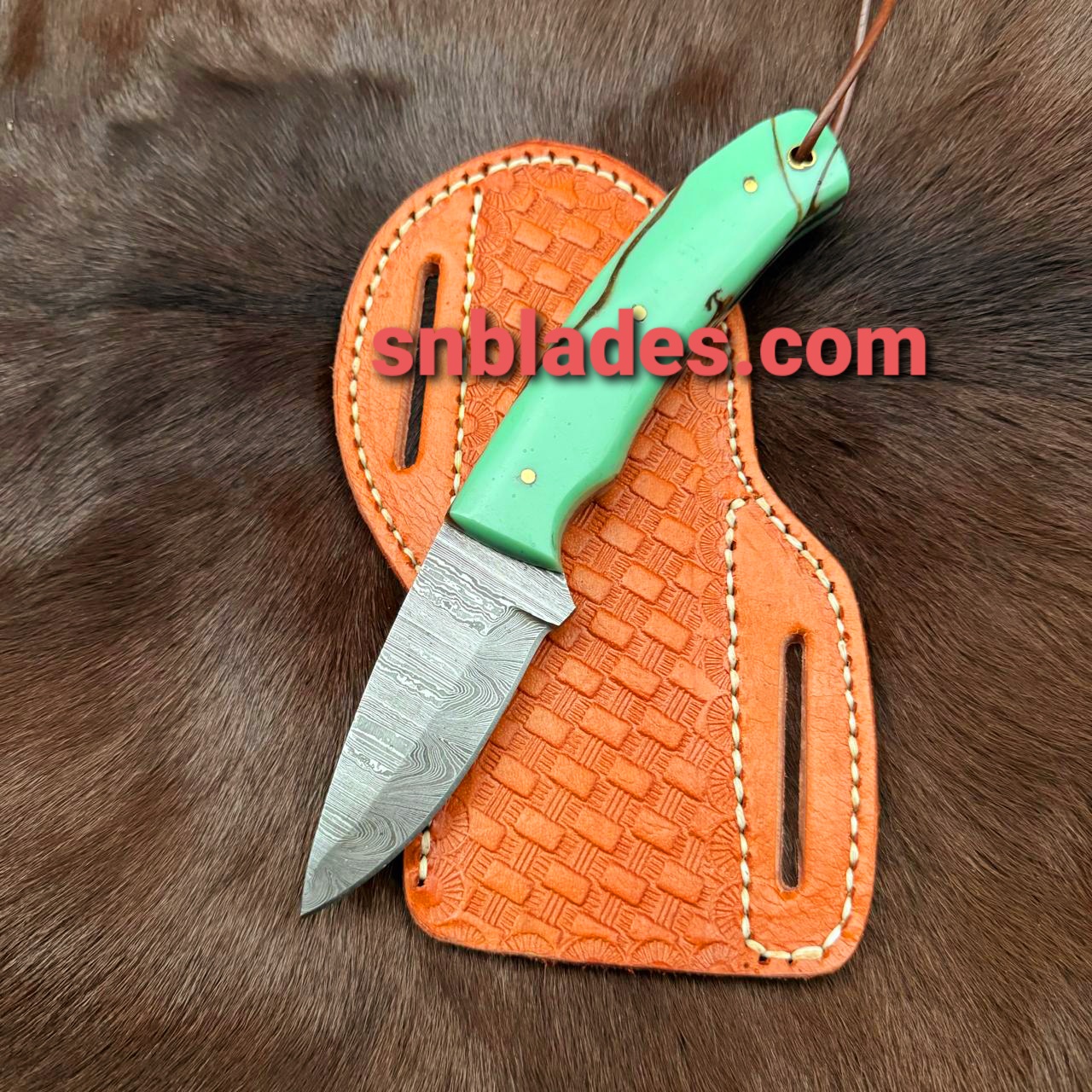 New Made DAMASCUS steel Skinner knife overall length 8″inch blade length 3″inch Handle made of Resin Hold edge and still long Time Comes with leather sheath
