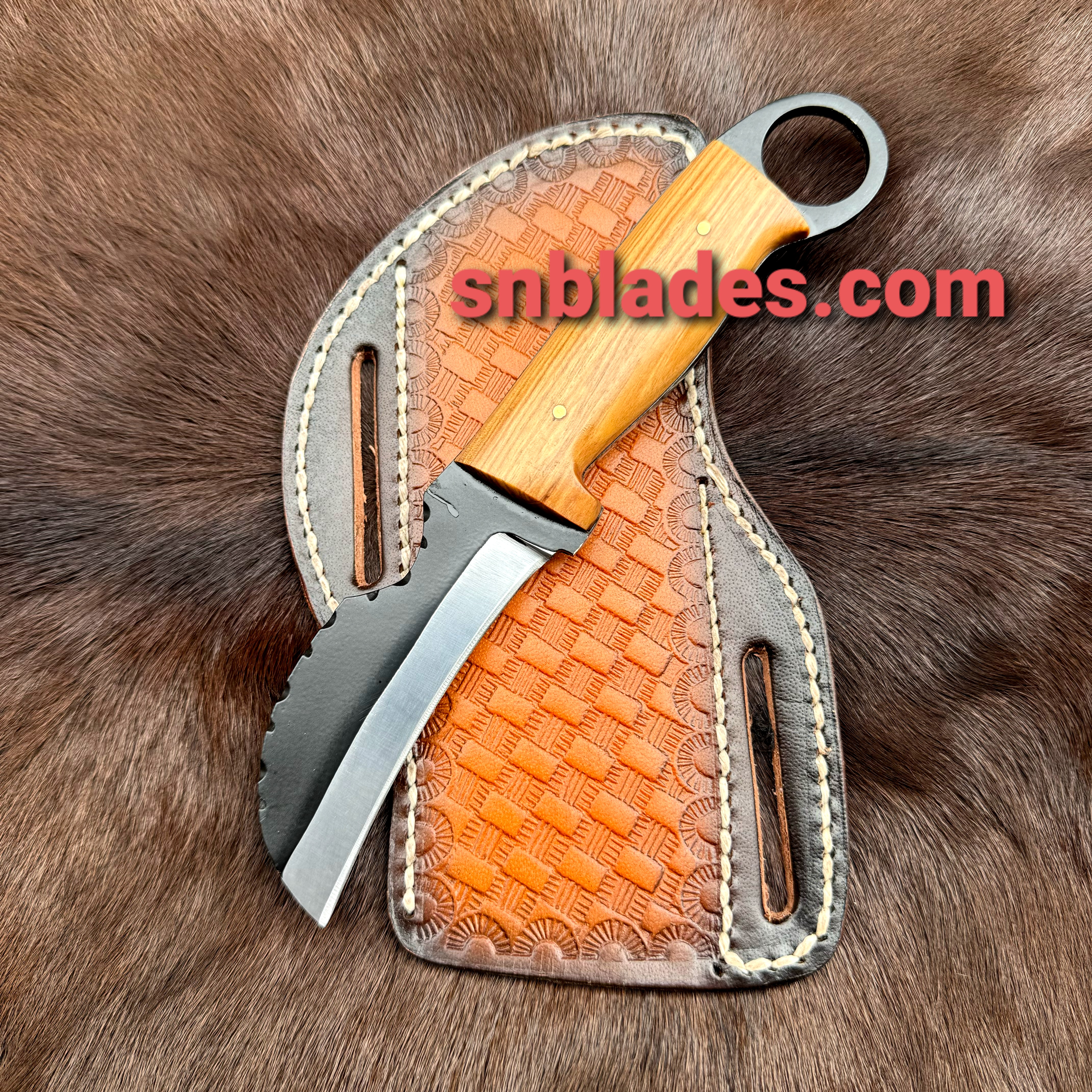 New Handmade 1095 steel Hawkbill lineman Skinner knife overall length 8″inch Handle made of olive Wood Hold edge and very sharp comfortable Handle Grip Comes with leather sheath.