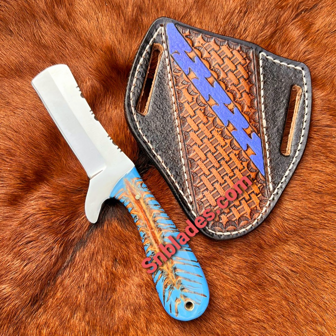Handmade 440 steel Western cowboy Bull Cutter knife with leather sheath overall length 8″inchs Handle made of pine coon Hold edge and comfortable grip Comes with leather Sheath.