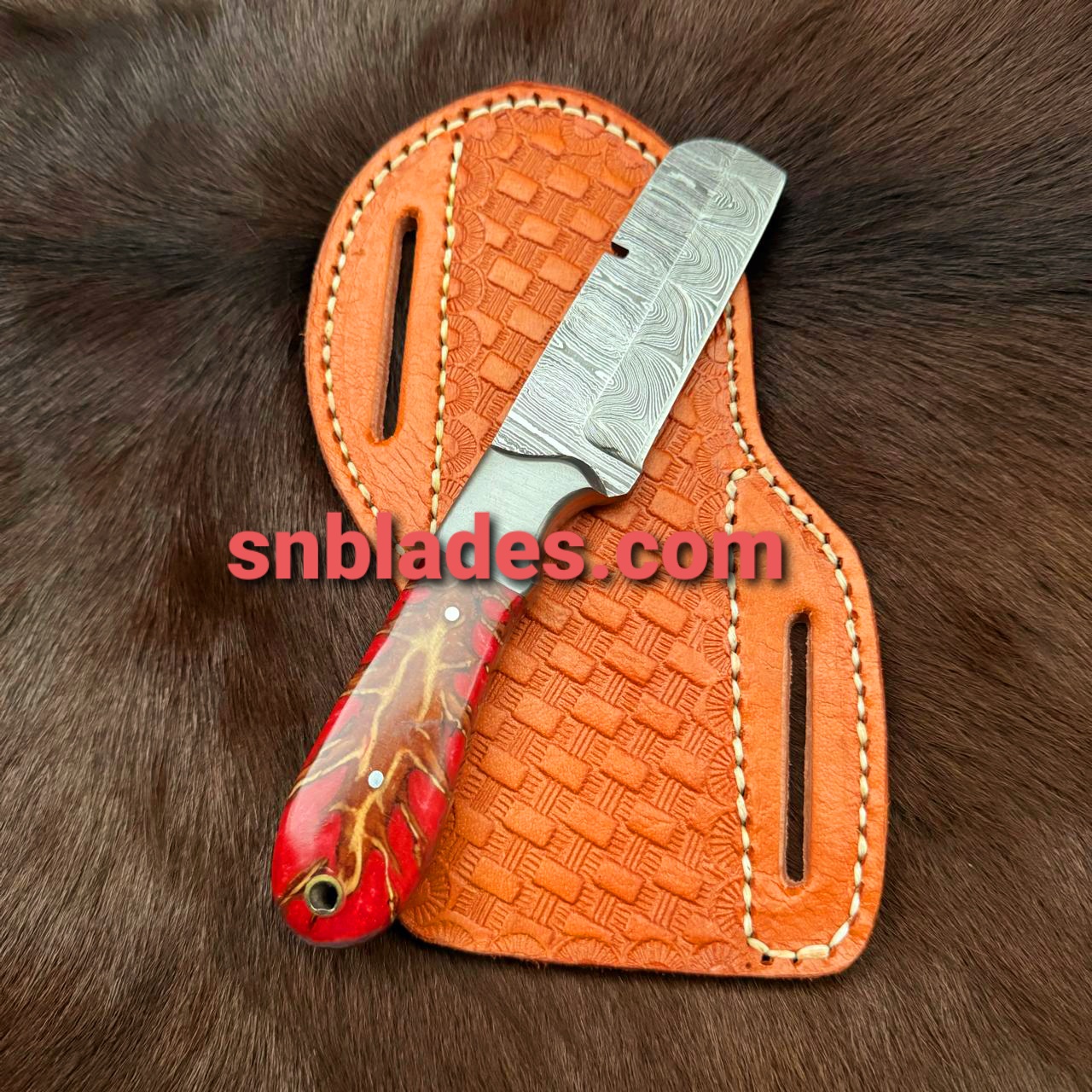 New Handmade Damascus Steel Bull Cutter knife overall length 8″inch Handle made of Pine Coon Resin Comfortable handle grip and Comes with Leather Sheath.