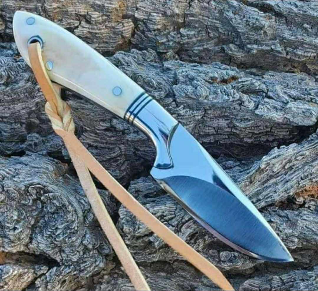 Handmade J2 steel Hunting Skinner knife overall length 8″inch Handle made of Camel Bone hold edge and Comfortable handle grip comes with leather sheath..