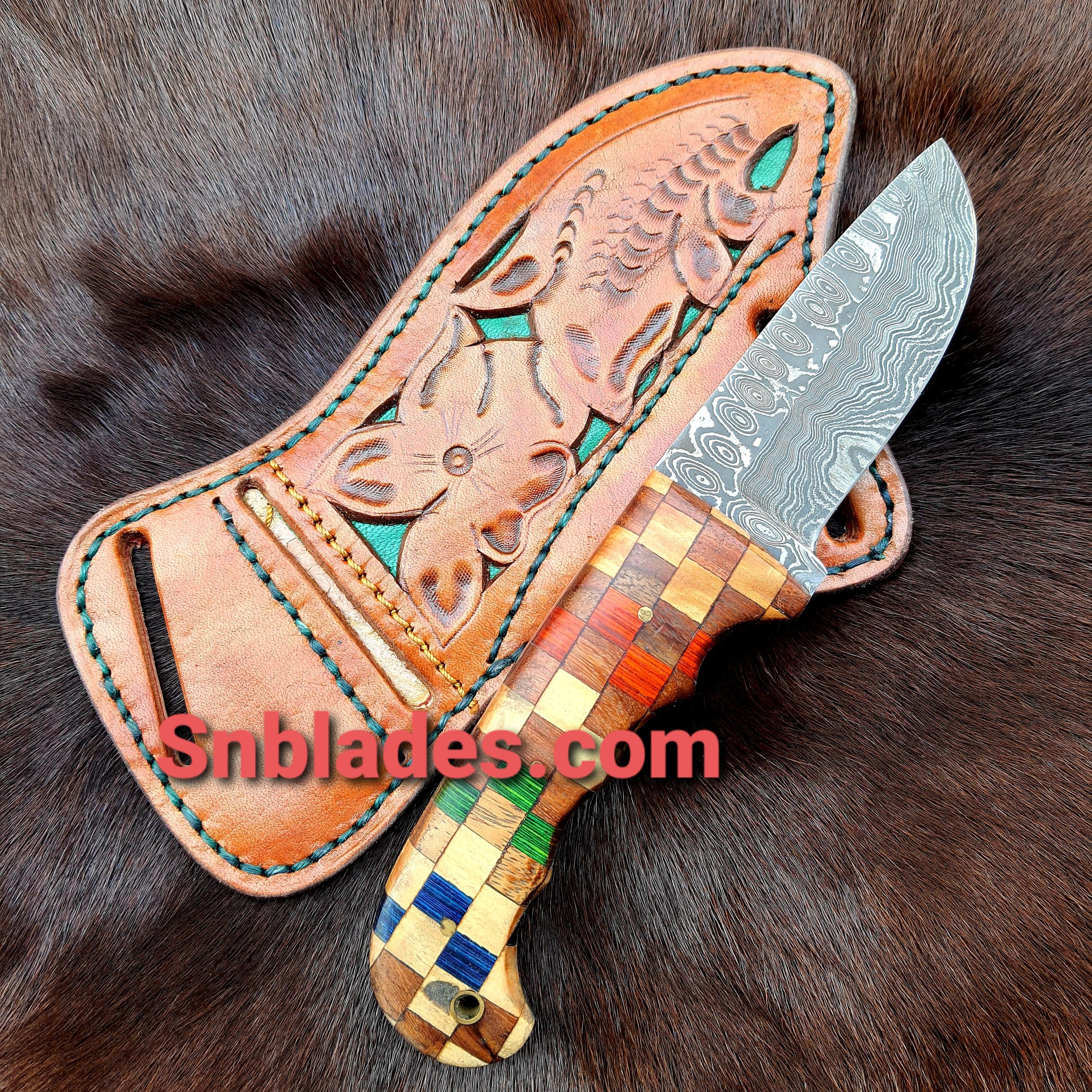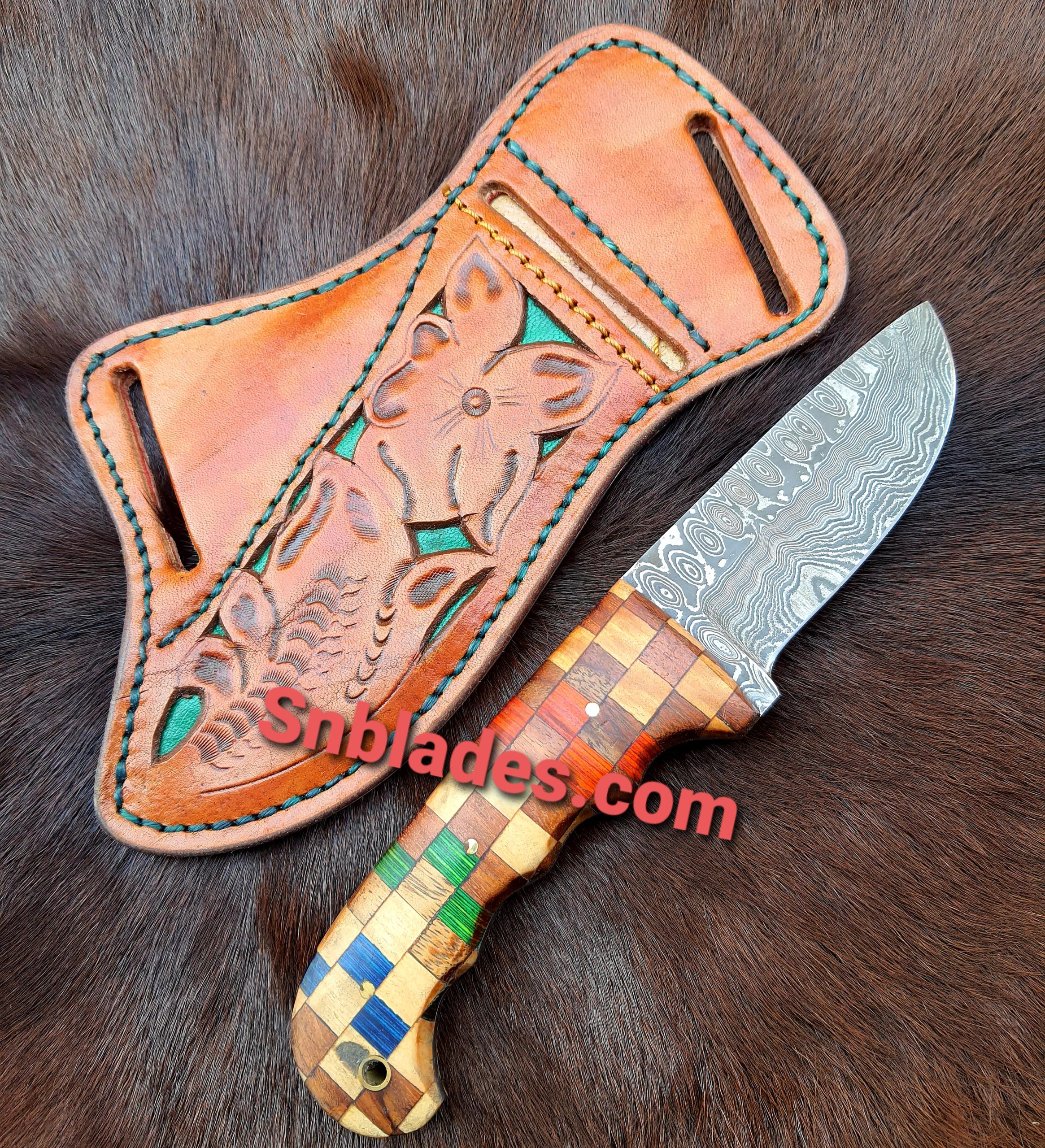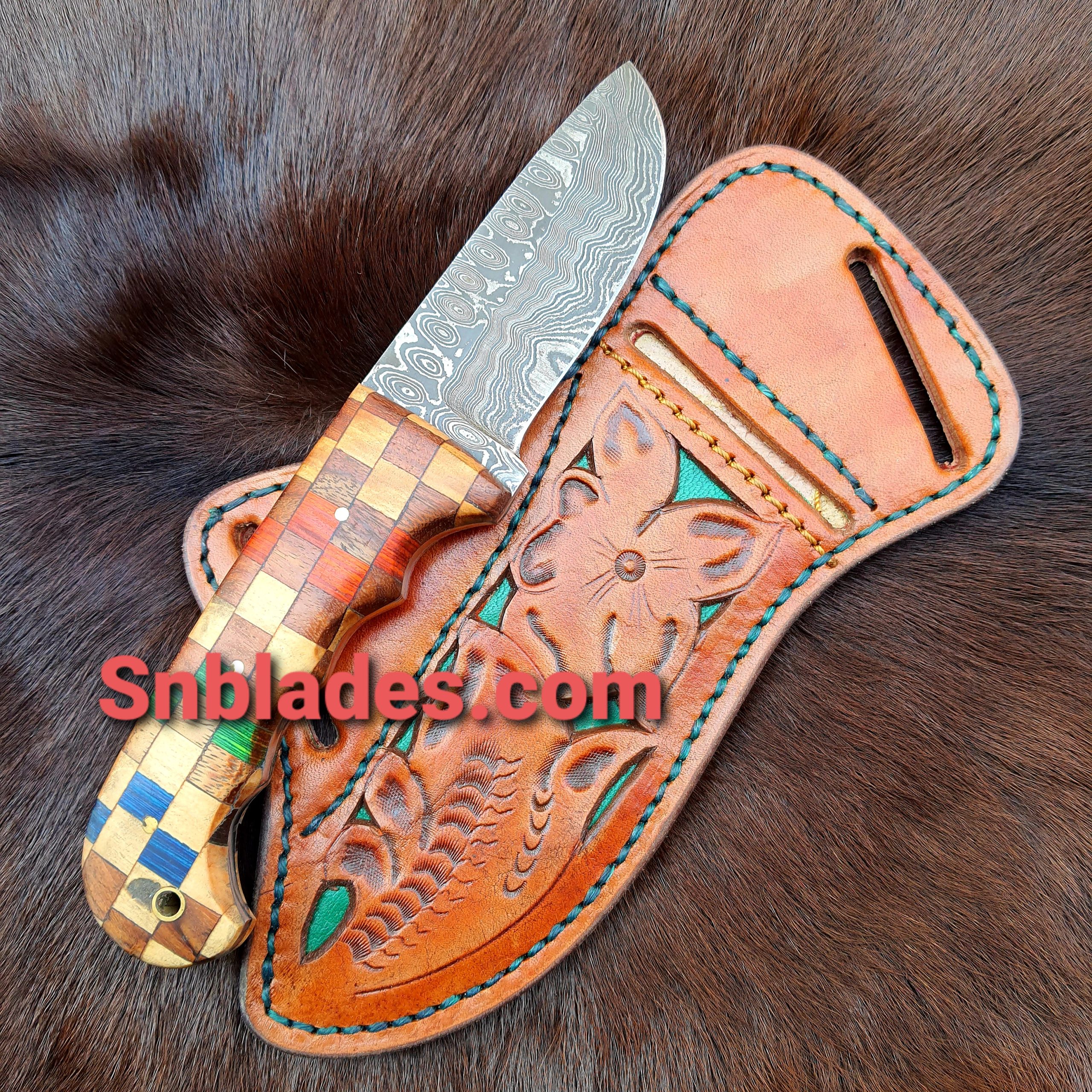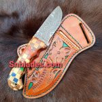 New Handmade Western Cowboy Hunting Skinner knife overall length 8″inch Handle made of color Wood Hold edge and comfortable handle Grip comes with leather Sheath.